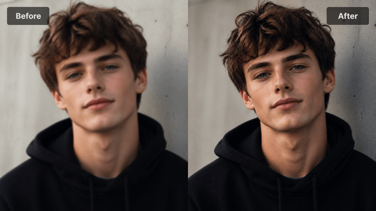 The model analyzes the image and refines what's already there — color balance, lighting, contrast, fine texture, and overall tonal feel. Nothing is added or invented; the photo just looks more polished and visually balanced.